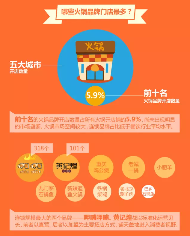 在經(jīng)營方式上,連鎖規(guī)模最大的呷哺呷哺和黃記煌都以標準化、模塊化的運營專長,分別以直營和加盟兩種發(fā)展方向,快速的占據(jù)了高量的市場份額。